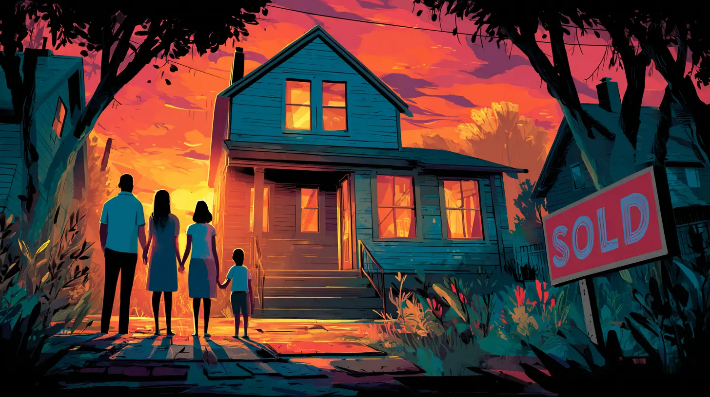 Illustration of two men shaking hands in the front yard of a house, symbolizing the successful closing and final agreement of a sale leaseback transaction or investment partnership.